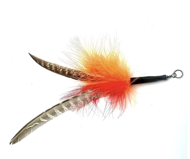 PURRS FEATHER SPINNER past op de Purrshengel. Deze kleurrijke pluim maakt fascinerende bewegingen waar elke kat wild van wordt.