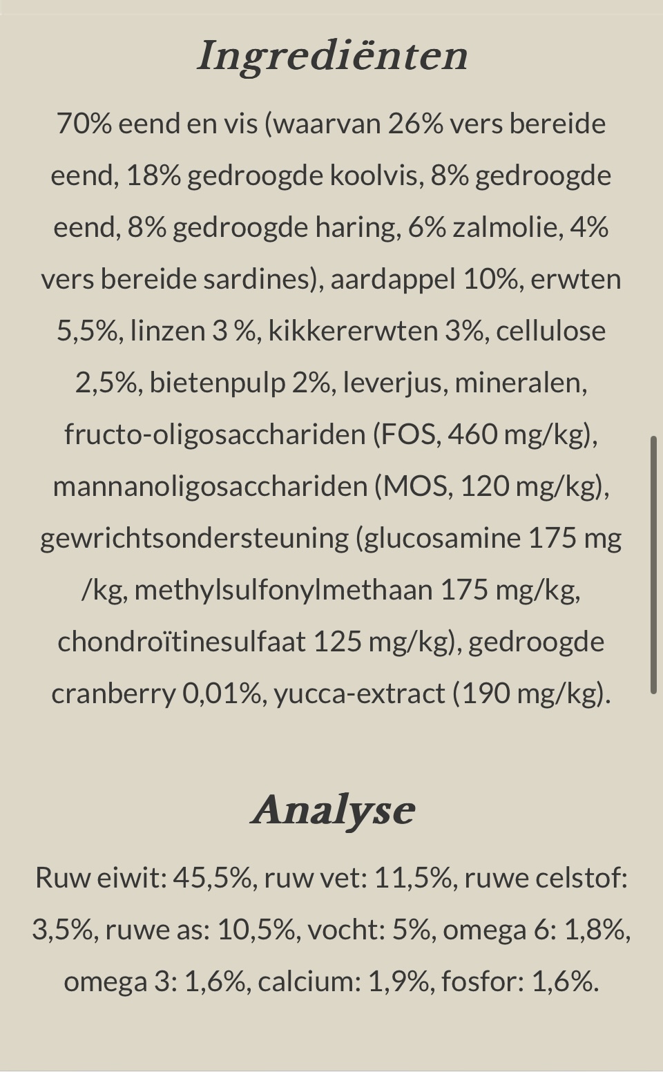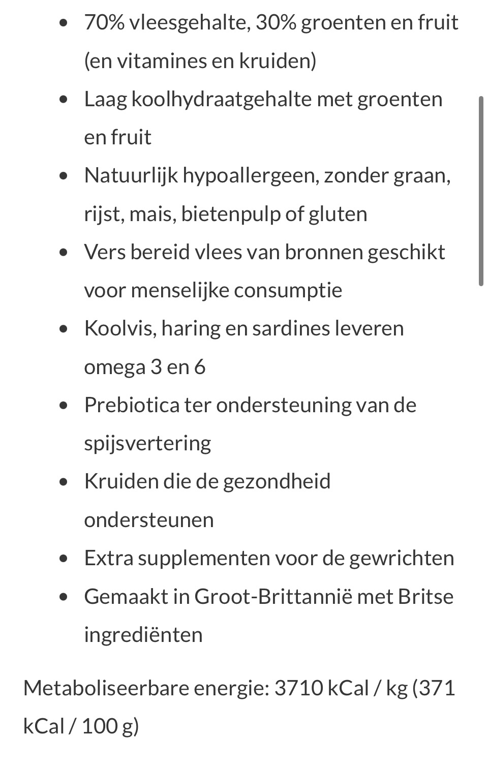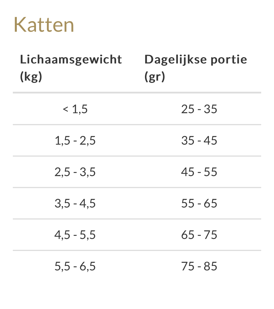 * nooit granen, dierlijke bijproducten, vulstoffen, zoetstoffen of smaakstoffen in hun voedsel te gebruiken