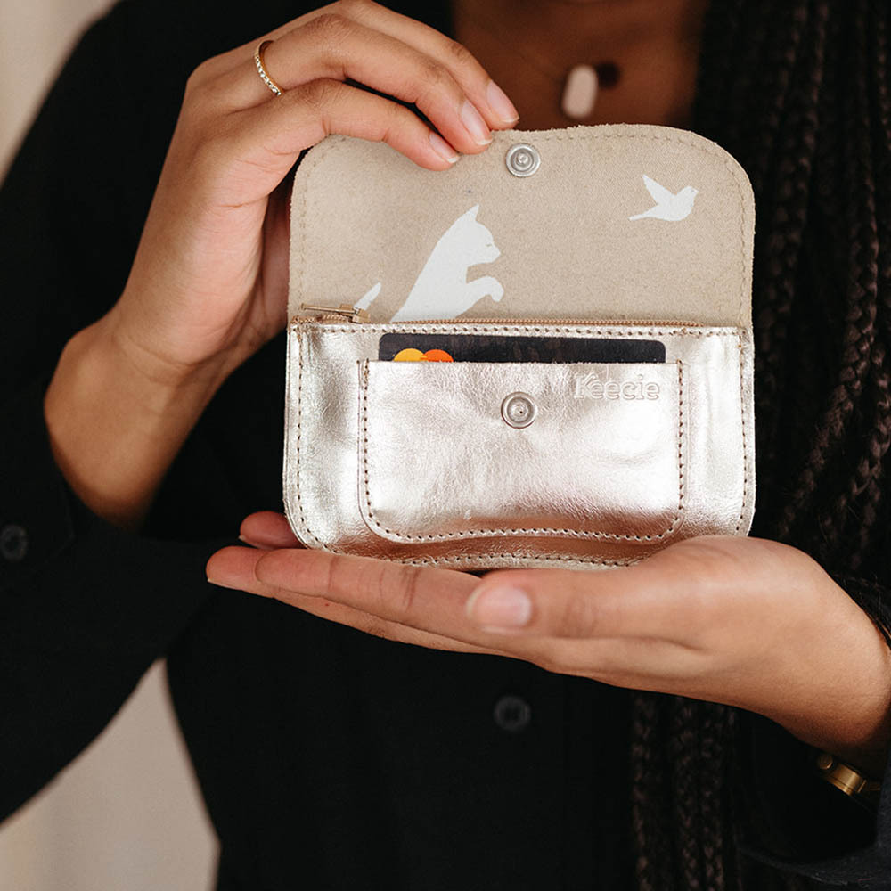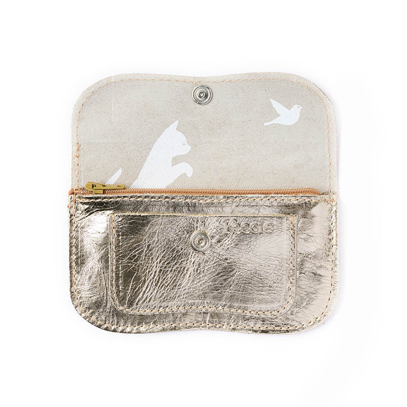 Ben jij zo iemand die van alles in haar portemonnee bewaart? Het toegangsbewijs van een mooie tentoonstelling waar je geweest bent, pasfoto’s, een oude post-it met lief berichtje… Nee? Dan is de Cat Chase small echt iets voor jou! Deze gouden leren portemonnee heeft precies voldoende vakjes om je briefgeld, muntgeld, rijbewijs en bankkaart in op te bergen. Omdat je eigenlijk verder niets nodig hebt.