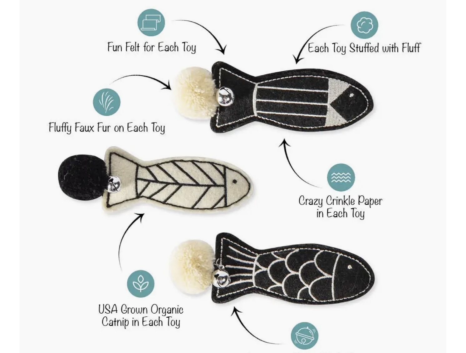 Elke vis is gevuld met biologisch kattenkruid en waanzinnig kreukpapier voor extra speelsensatie.