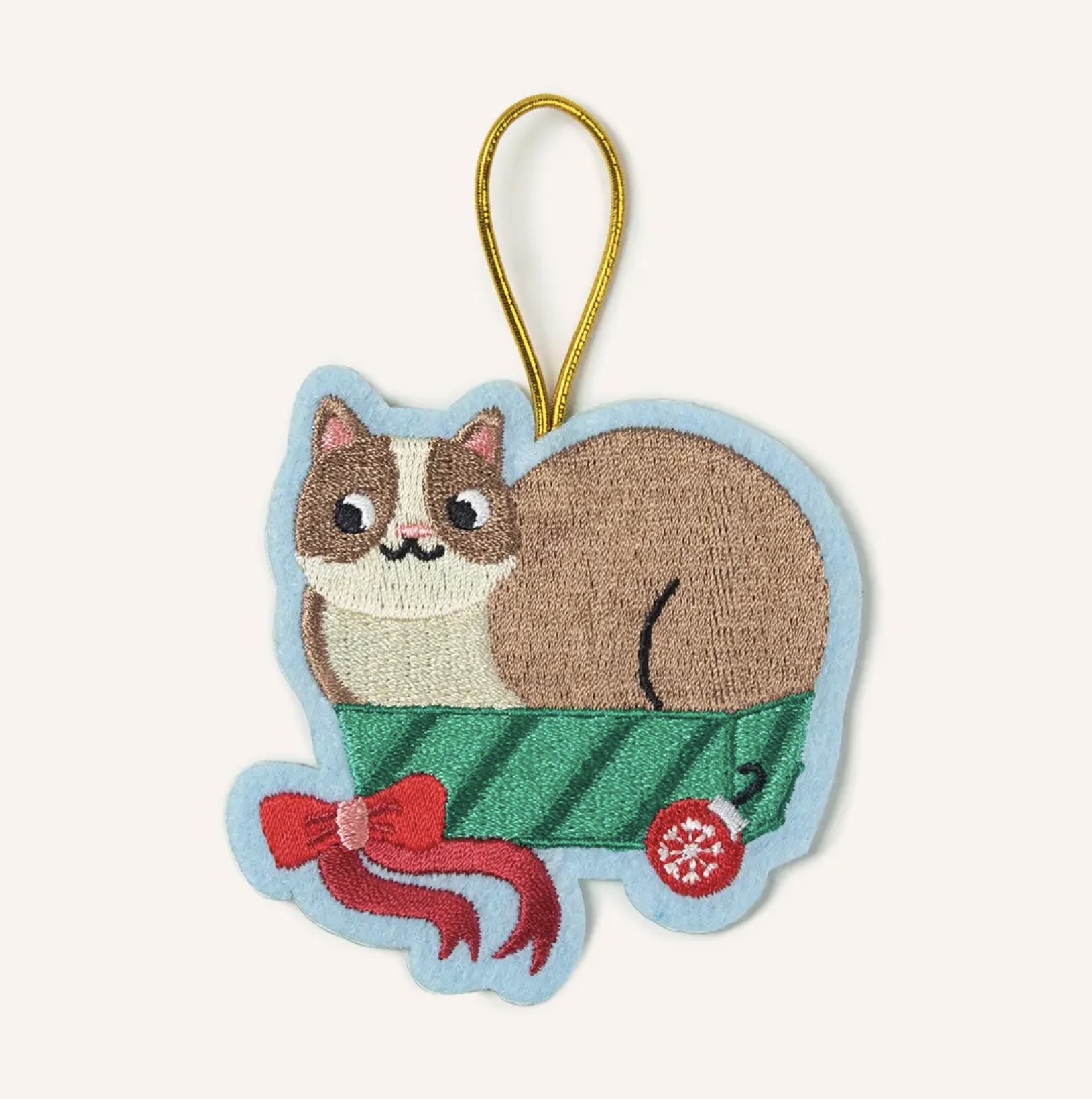 Een kat die gezellig in zijn geschenkdoos zit, nadat deze was uitgepakt. Deze geborduurde ornamenten zijn charmant voor je boom en zijn een geweldig cadeau. Perfect voor kattenliefhebbers