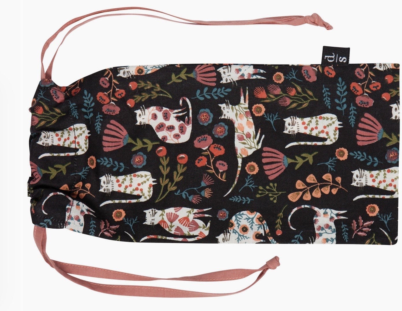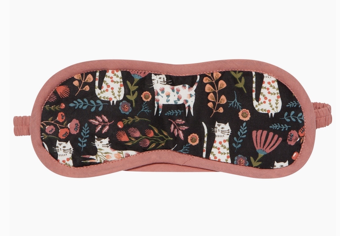 Het slaapmasker heeft een fancy print van bloemige katten die de wereld verkennen op hun eigen manier.