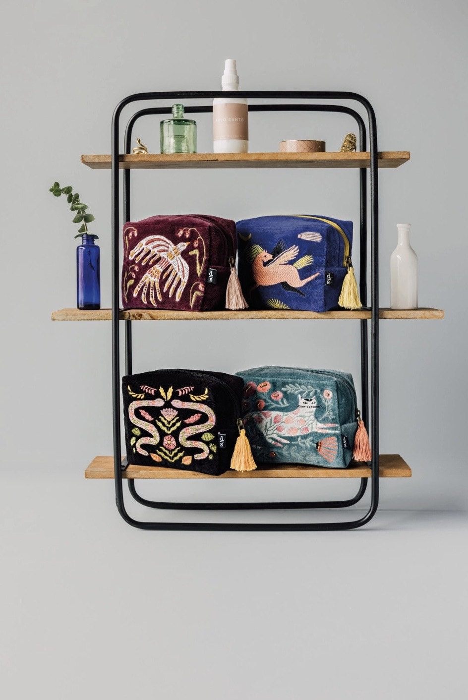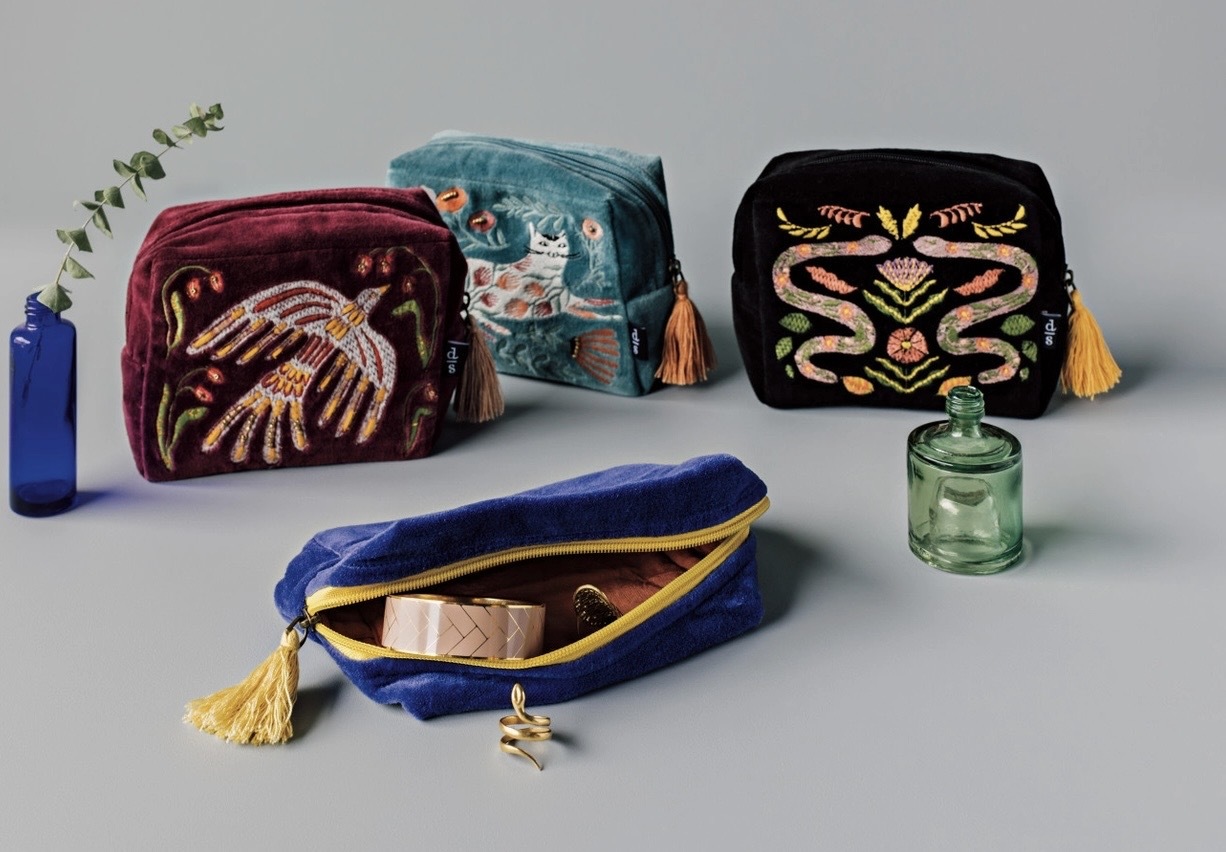 Dit elegante geborduurde zakje van katoenfluweel is versierd met kwastjes en kralen. Het heeft een zachte maar stevige ruimte om al je snuisterijen en schatten in op te bergen.