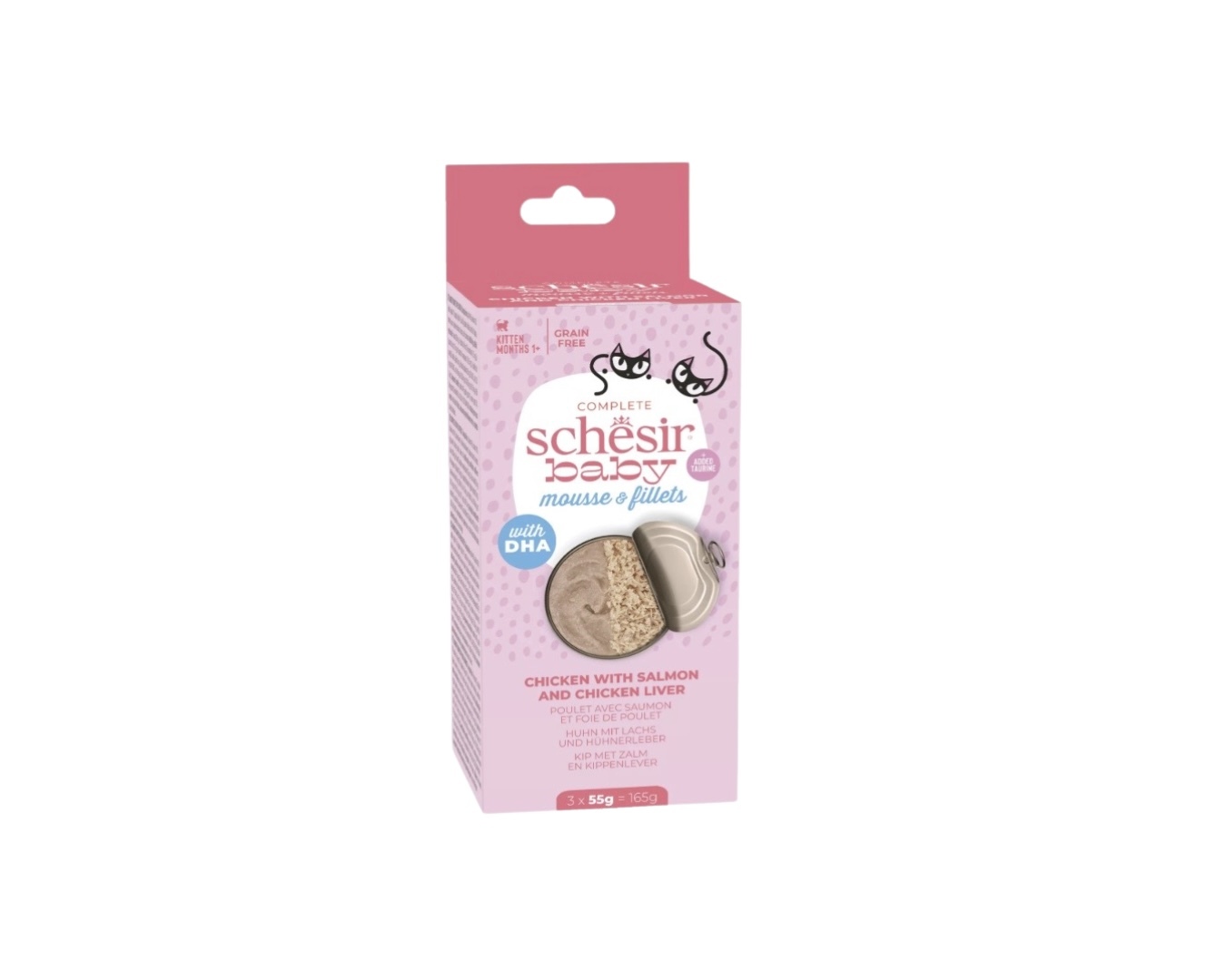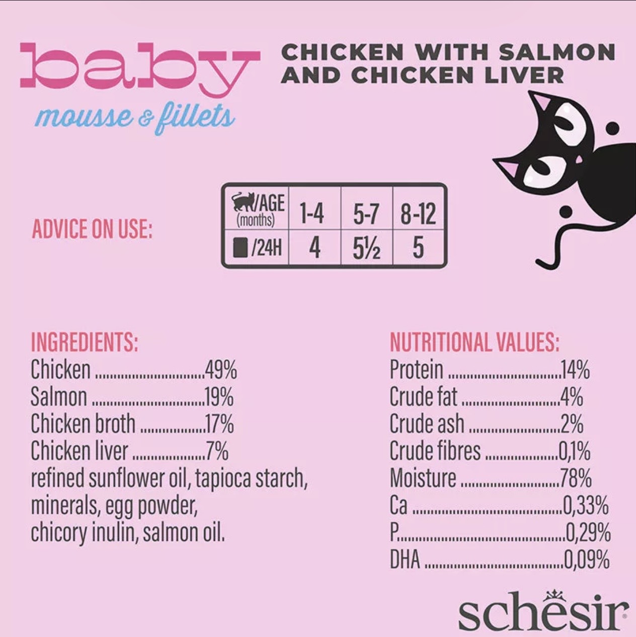 Elk recept is speciaal samengesteld om de groei van je kleine vriendje te ondersteunen, op basis van echte kipfilets, met fijngesneden, voedende en smakelijke kippenlever en zalm, in een originele dubbele consistentie van mousse en fijngesneden filets om het kitten te begeleiden bij de overgang naar vast voedsel.