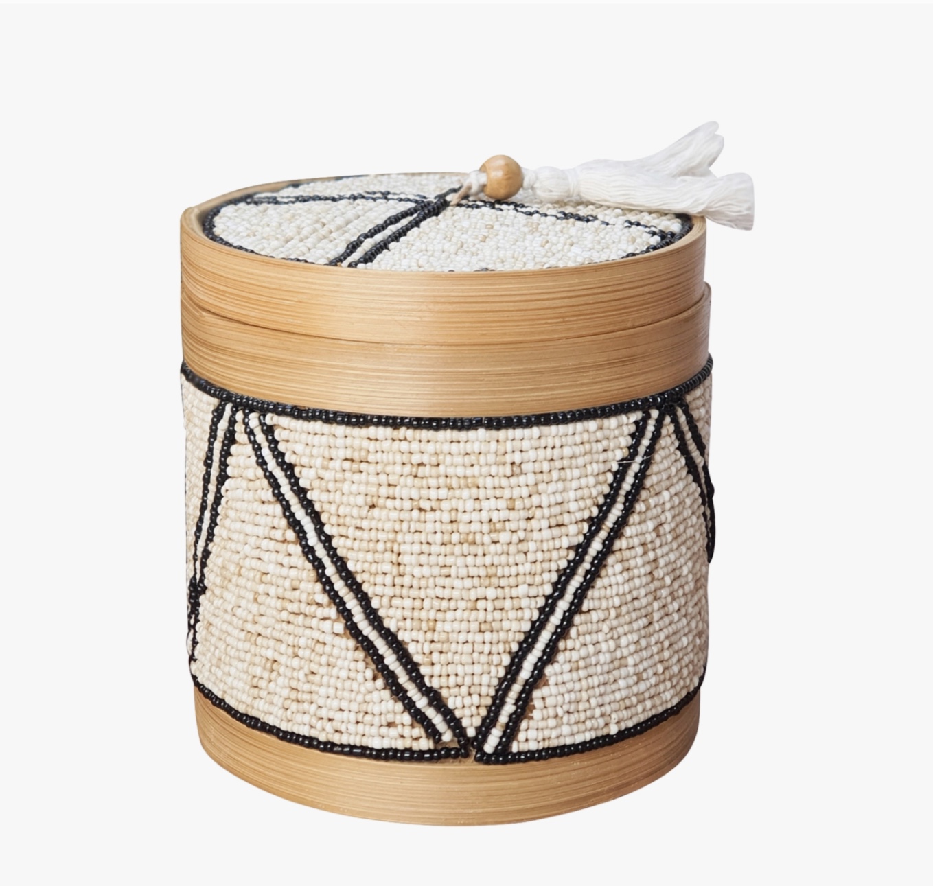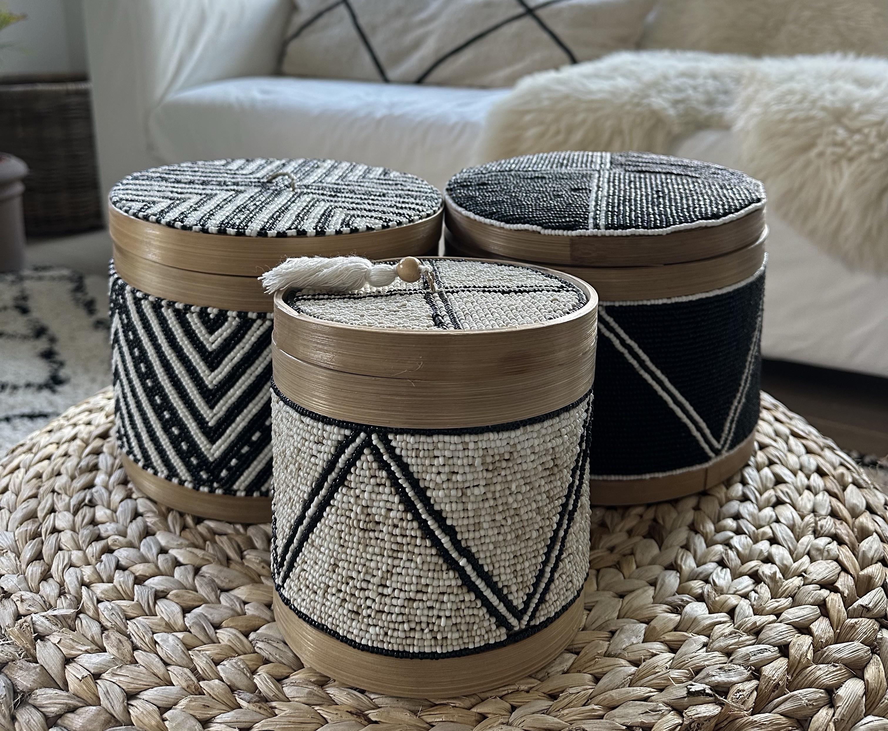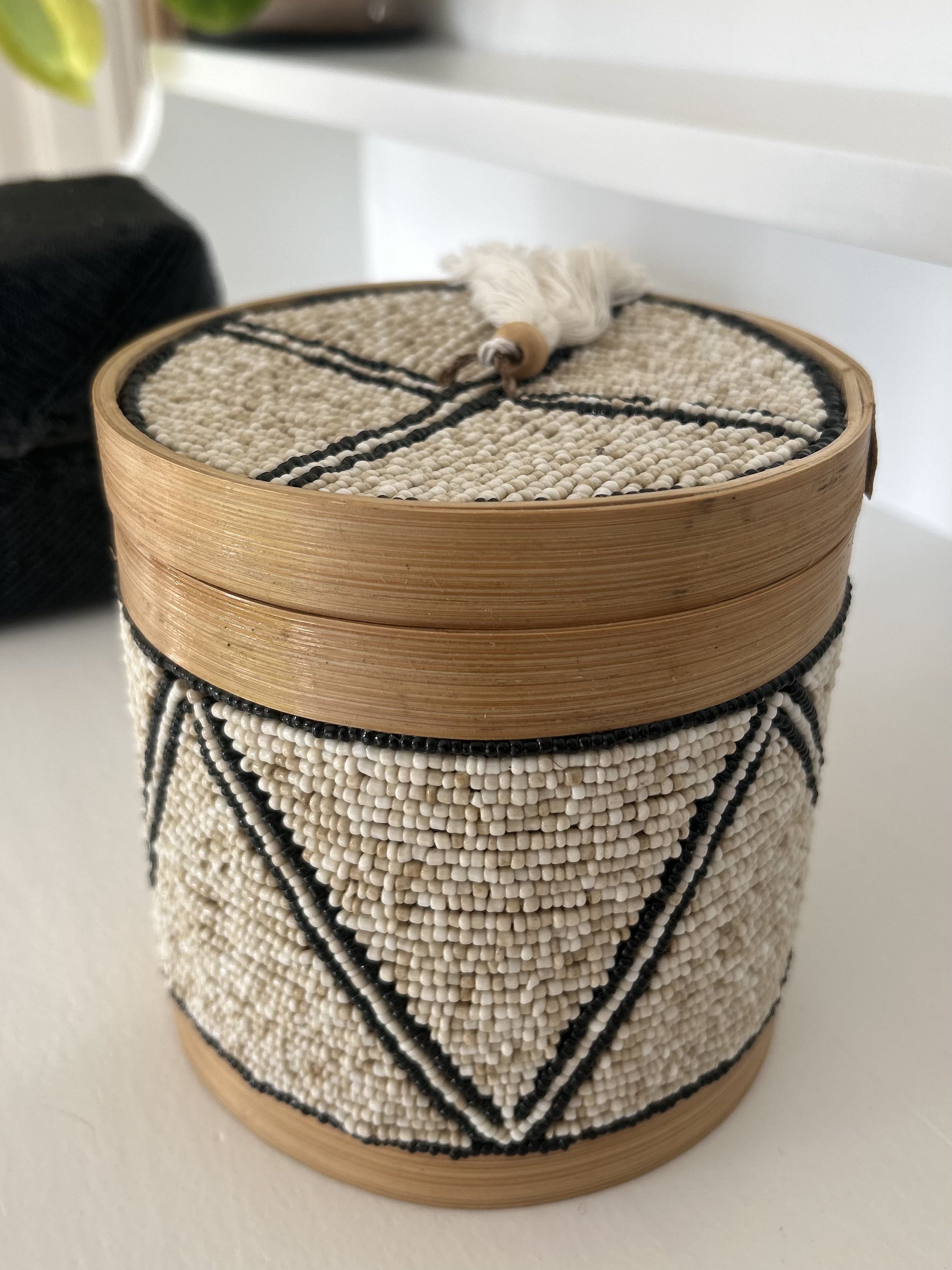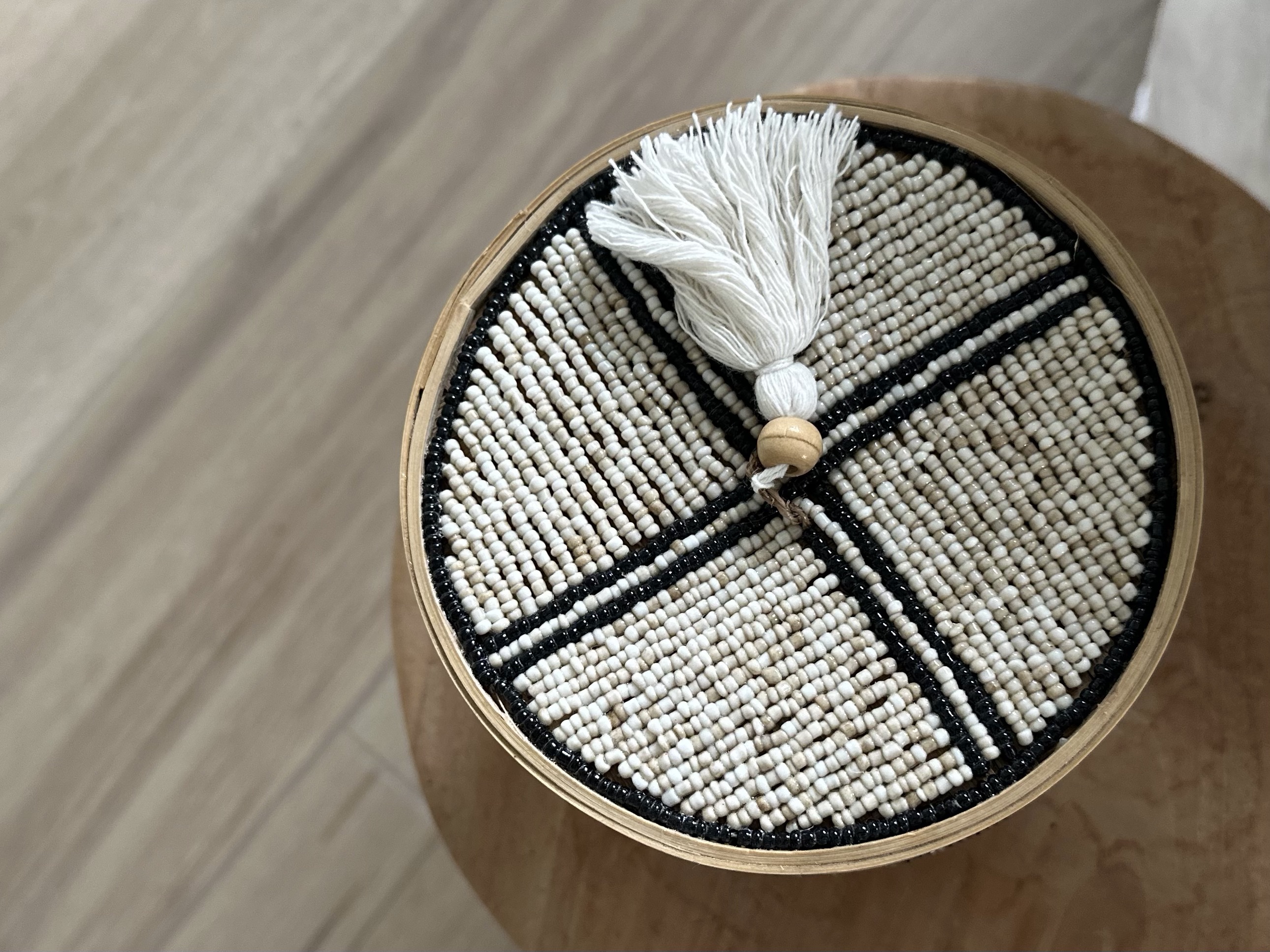 Deze kralenmand heeft een unieke uitstraling en is gemaakt van natuurlijke materialen.